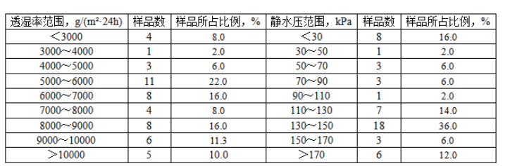 可見,防水透濕面料倒杯 - 蒸發法的透濕率基本符合正態分布,≤ 4000g/(m2·24h)的比例為10.0%,> 10000g/(m2·24h)的比例 10.0%,一半以上測試結果集中在 5000~ 9000 g/(m2·24h)。而靜水壓測試結果相對比較分散,≤ 30kPa 的比例為 16.0%,> 170kPa 的比例為 12.0%,70% 以上的測試結果大于 70kPa。以 GB/T 32614-2016《戶外運動服裝 沖鋒衣》中對沖鋒衣面料 I 級功能性要求而言,即洗滌前透濕率≥ 5000g/(m2·24h),靜 水 壓 ≥ 50kPa,50 塊 面 料 透 濕 率 合 格 率 為84.0%,靜水壓合格率為 82.0%,合格率基本一致。但靜水壓指標相對更好,三分之二的樣品靜水壓> 100kPa,遠遠滿足標準要求,這也驗證了靜水壓指標通過在織物表面的涂層處理很容易符合標準要求。將 GB/T 4744-2013《紡織品 防水性能的檢測和評價 靜水壓法》及臺灣標準 CNS 15000-2010《防水透濕紡織品性能評估》[8] 對靜水壓的評價性能列如表 4 所示。