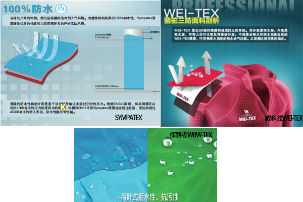 威科技WEI-TEX:WEI-TEX面料是吳江同洲紡織有限公司主打的面料品牌之一,具有良好的防風防水及透濕透氣特性,是北京大臺北戶外及駱駝圣弗萊戶外的主打面料。WEI-TEX面料采用的是PU聚氨酯材質,這一點與大部分面料一樣。