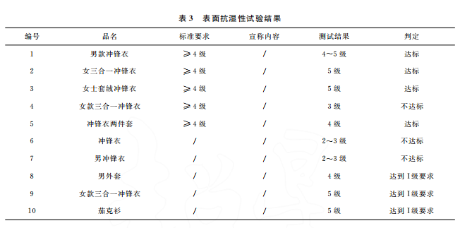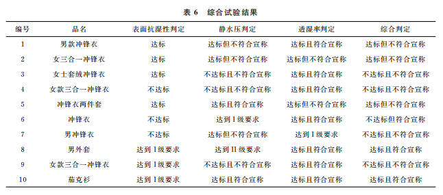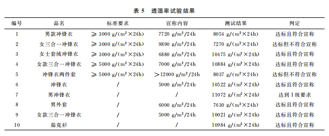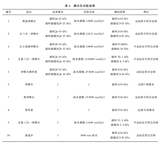 本文最終的判定是結(jié)合 GB/T32614—2016《戶外運動服裝 沖鋒衣》中面料功能性要求和產(chǎn)品銷售時的吊牌宣稱進行。達標是指符合沖鋒衣的合格品 標 準 要 求,反 之 則 不 符 合。10 件 樣 品中,只有5件達標,且只有3件是符合吊牌宣稱內(nèi)容。其中,標示了 GB/T32614—2016的沖鋒衣,有3件達標,合格率為60%。近年來,監(jiān)管部門的抽查合格率一般在80%左右。這次比較試驗合格率偏低的原因可能是樣品量較少,樣品的價格區(qū)間比較集中,且考核了接縫處的靜水壓。值得注意的是有2件沒有標示 GB/T32614—2016的外套,其性能都符合標準要求。此外,銷售方對靜水壓的宣稱都偏高,有3件達標了卻不符合自身的宣稱內(nèi)容。沖鋒衣 GB/T32614—2016標準 中 I級 對 靜 水 壓 的 要 求 也 只是:面料≥50kPa和面料接縫處≥50kPa,銷售 方卻往往宣稱100kPa,甚至達150kPa,而且也沒有充分考慮到面料接縫處靜水壓值會相對偏小的現(xiàn)實。需要警 醒 的 是,5 件 標 示 了 GB/T32614—2016的沖鋒衣其綜合宣傳都不符合規(guī)定,存在執(zhí)行標準標注正確卻夸大宣傳的嫌疑。