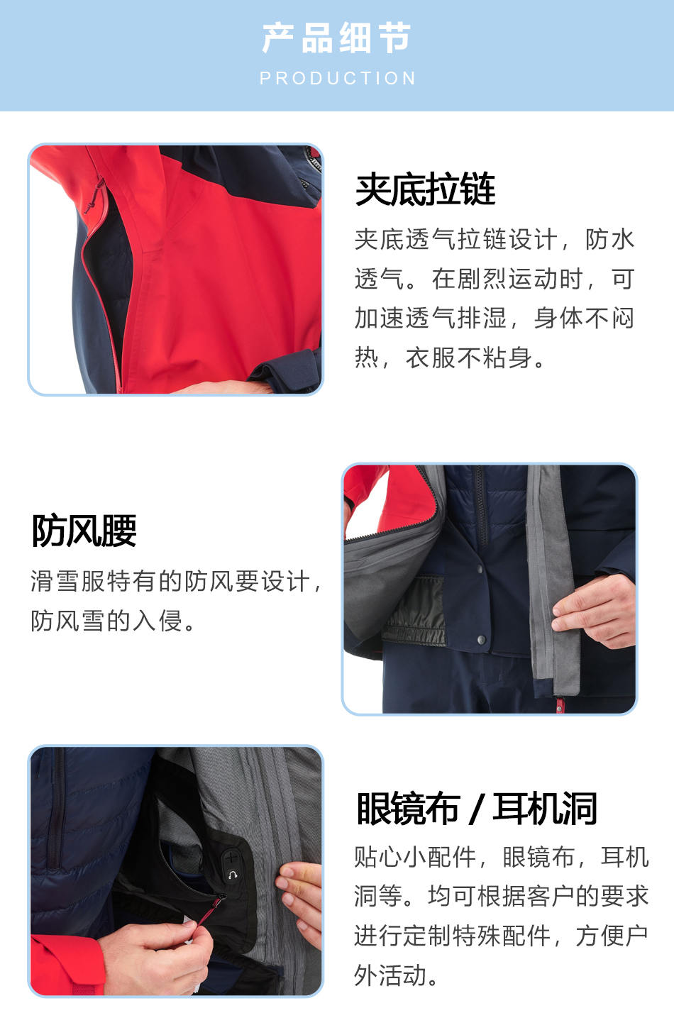 • 防風腰壓膠滑雪服生產具特有的防風要設計,防風雪的入侵。